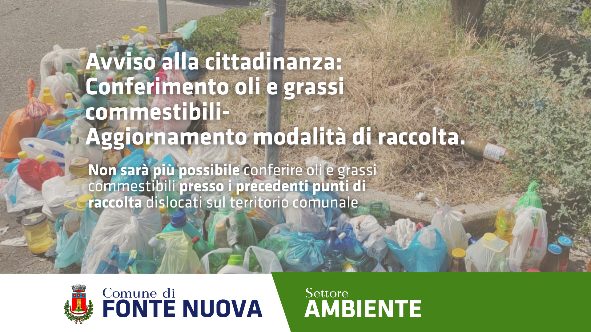 Il Settore Ambiente del Comune di Fonte Nuova informa la cittadinanza che non è più possibile conferire oli e grassi commestibili presso i precedenti punti di raccolta dislocati sul territorio comunale: