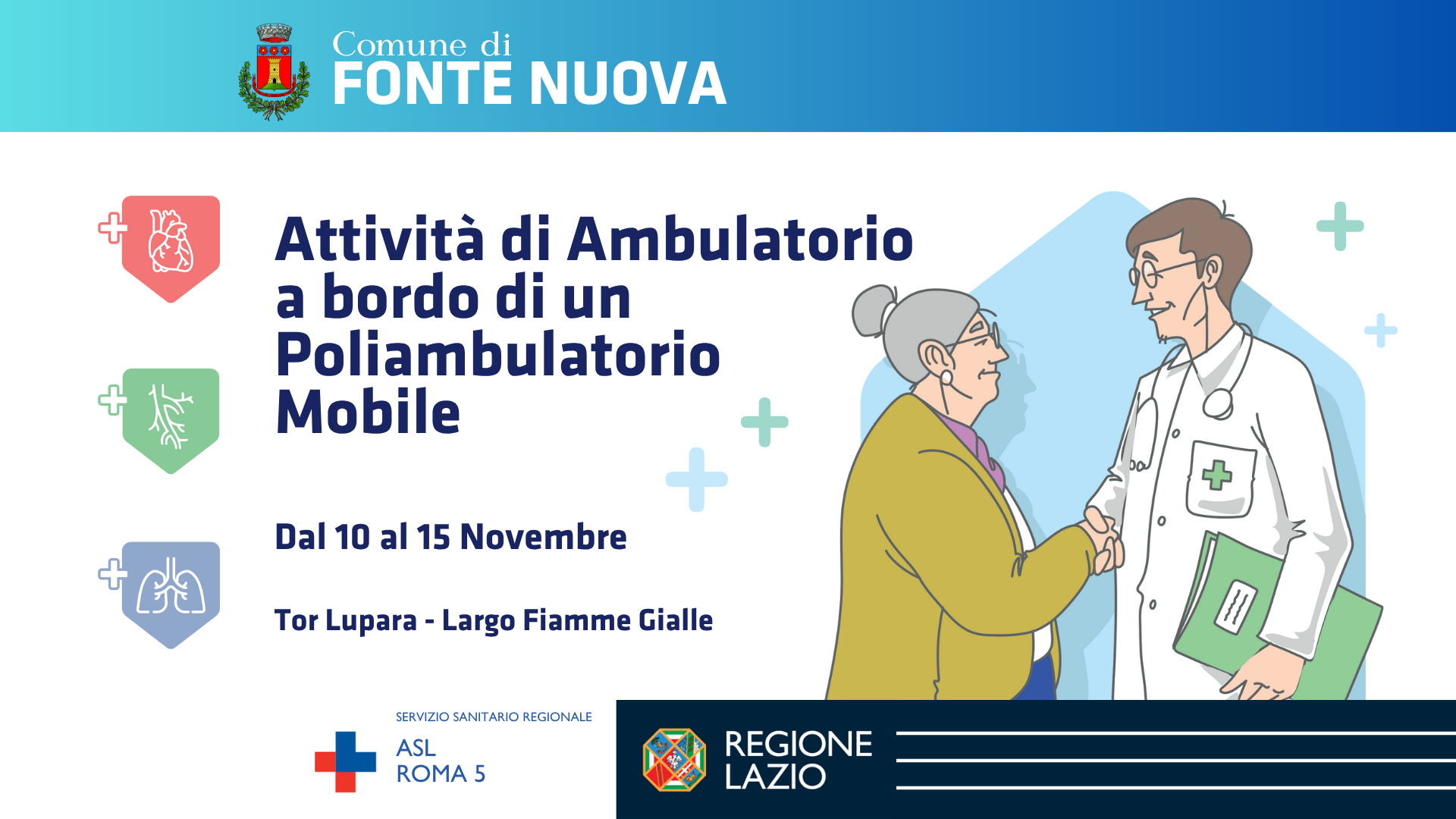 Il Comune di Fonte Nuova informa la cittadinanza che, grazie alla collaborazione con la Regione Lazio e la ASL Roma 5, sarà presente a Fonte Nuova, in Largo Fiamme Gialle, un poliambulatorio mobile dedicato alla prevenzione e alla salute, attivo dal 10 al 15 novembre 2025, dalle ore 09:00 alle 18:00.