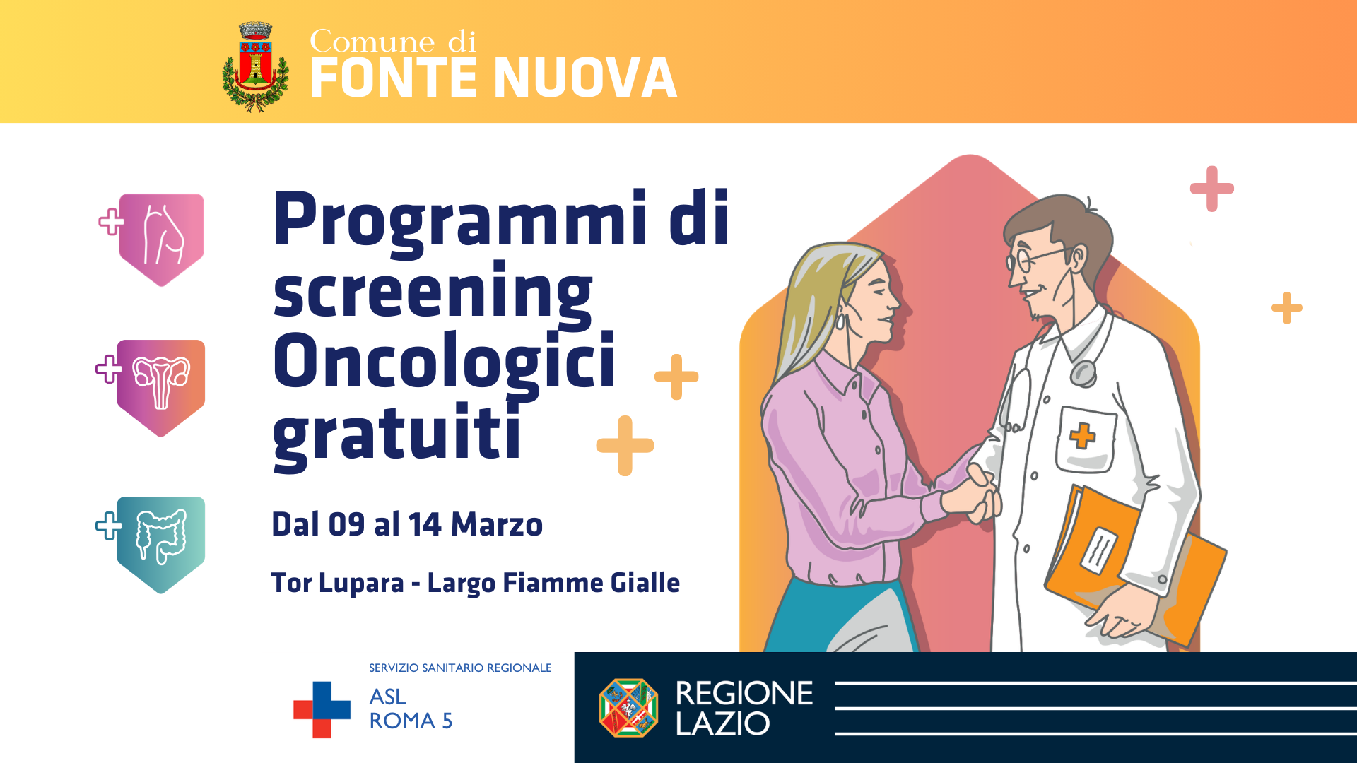 Il Comune di Fonte Nuova informa la cittadinanza che, grazie alla collaborazione con Regione Lazio e ASL Roma 5, sarà presente a Fonte Nuova, in Largo Fiamme Gialle, un poliambulatorio mobile dedicato alla prevenzione oncologica.